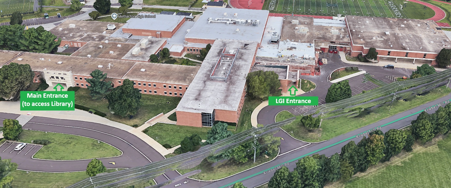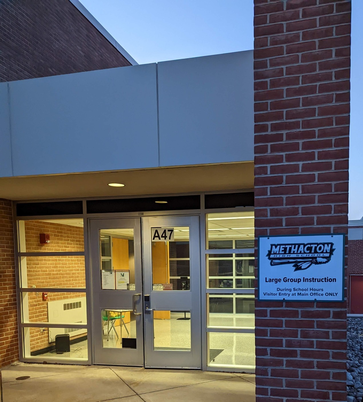 The session will take place in the Methacton High School LGI room - The door number is "A47" and there is also a green & white sign with the Methacton logo and "Large Group Instruction" on it.